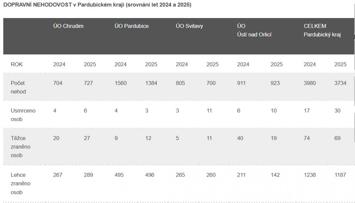 Dopravních nehod vloni v kraji ubylo o 6,2 procent, úmrtnost na silnicích ale výrazně vzrostla, přesně o 76,5 procent. „V loňském roce jsme řešili o 246 dopravních nehod méně než v roce předchozím. V rámci celého kraje jsme v roce 2025 šetřili celkem 3 734 dopravních nehod," okomentovala policejní mluvčí Dita Holečková nehody za celý Pardubický kraj, které stály život 30 osob, dalších 69 bylo zraněno těžce a 1187 lehce.