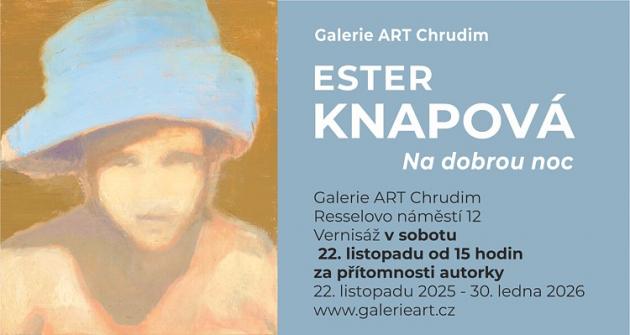 Výstava s názvem Na dobrou noc představuje velká i malá plátna Ester Knapové. Autorčina díla působí jako snové sondy do paměti, v nichž se lyrická krajina stává prostorem tichých návratů do dětství, k rodinným fotografiím a vyjadřuje intenzivníí vztah k přírodě.