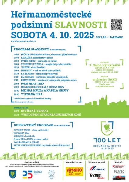 Heřmanův Městec - V sobotu 4. října ožije celé město oslavou 700. výročí od zmínky o Heřmanově Městci. Na náměstí a v přilehlém okolí se konají Podzimní slavnosti a Dny vína. Vystoupí mnoho umělců, otevře se nabídka regionálních produktů s ochutnávkou vín. Program je koncipován i na mladší návštěvníky. Oslavy proběhnou také v krásném zámeckém parku.
