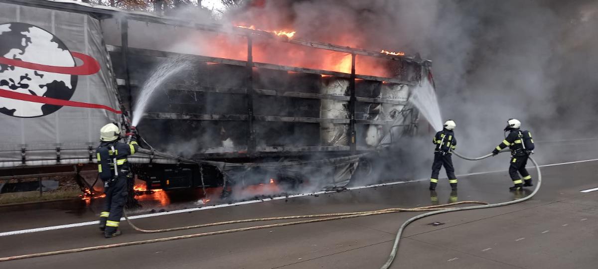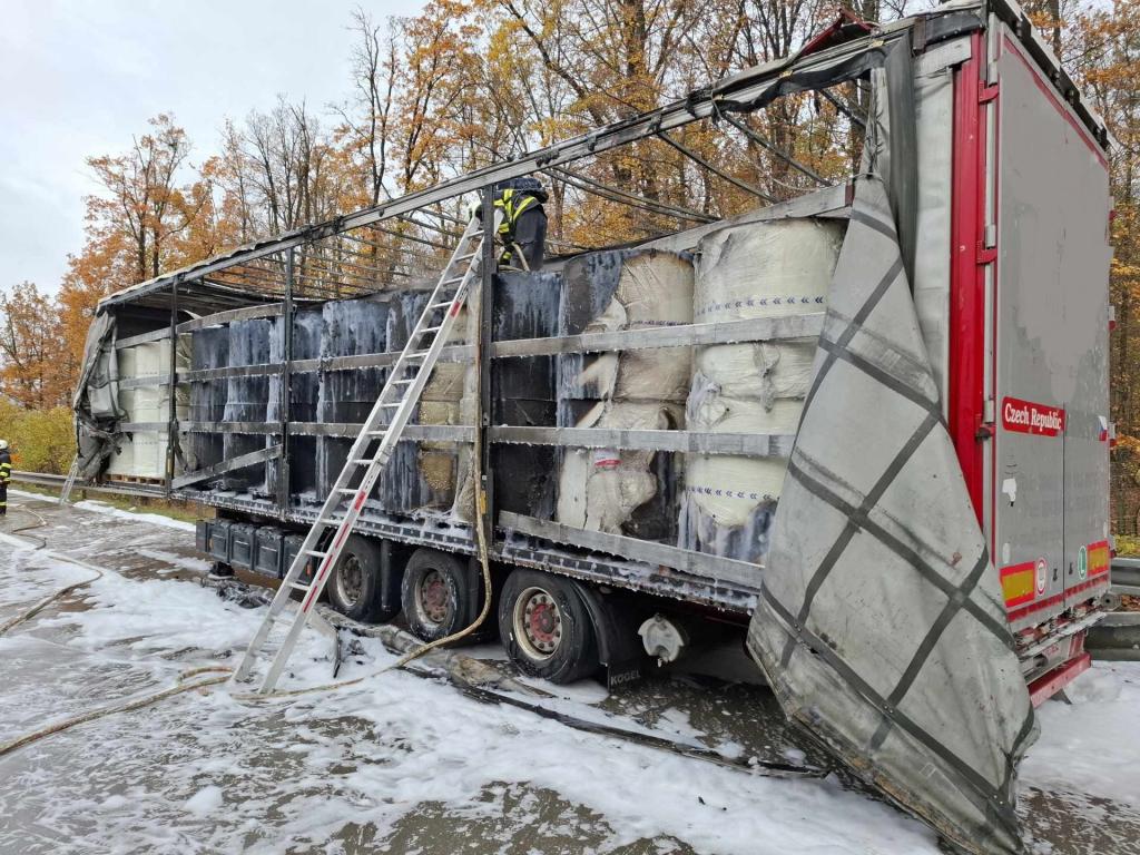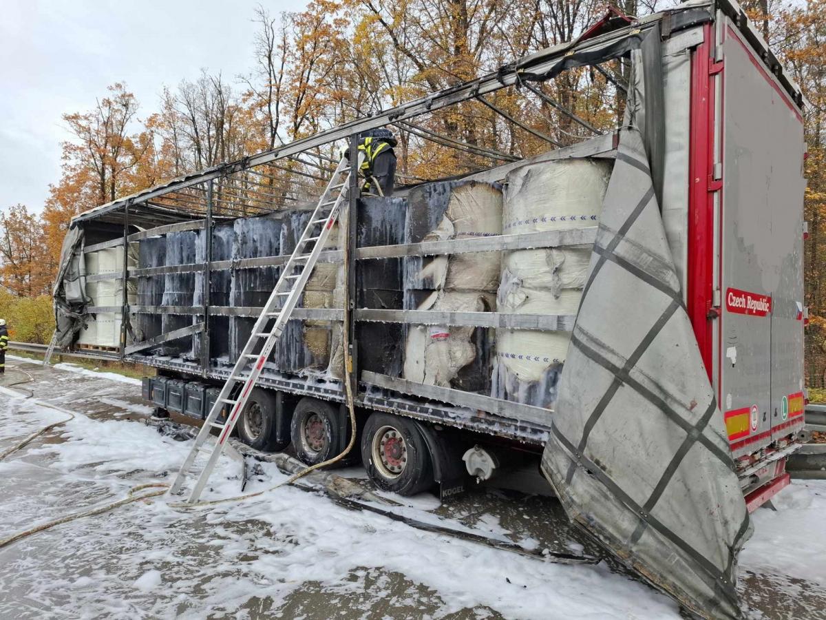 Při příjezdu složek intergrovaného záchranného systému na místo požáru, lokalizovaného v 10:49 hodin na 71. kilometru dálnice D11, byl návěs tahače už celý v plamenech a s ním i všechno zboží přepravované v balících.