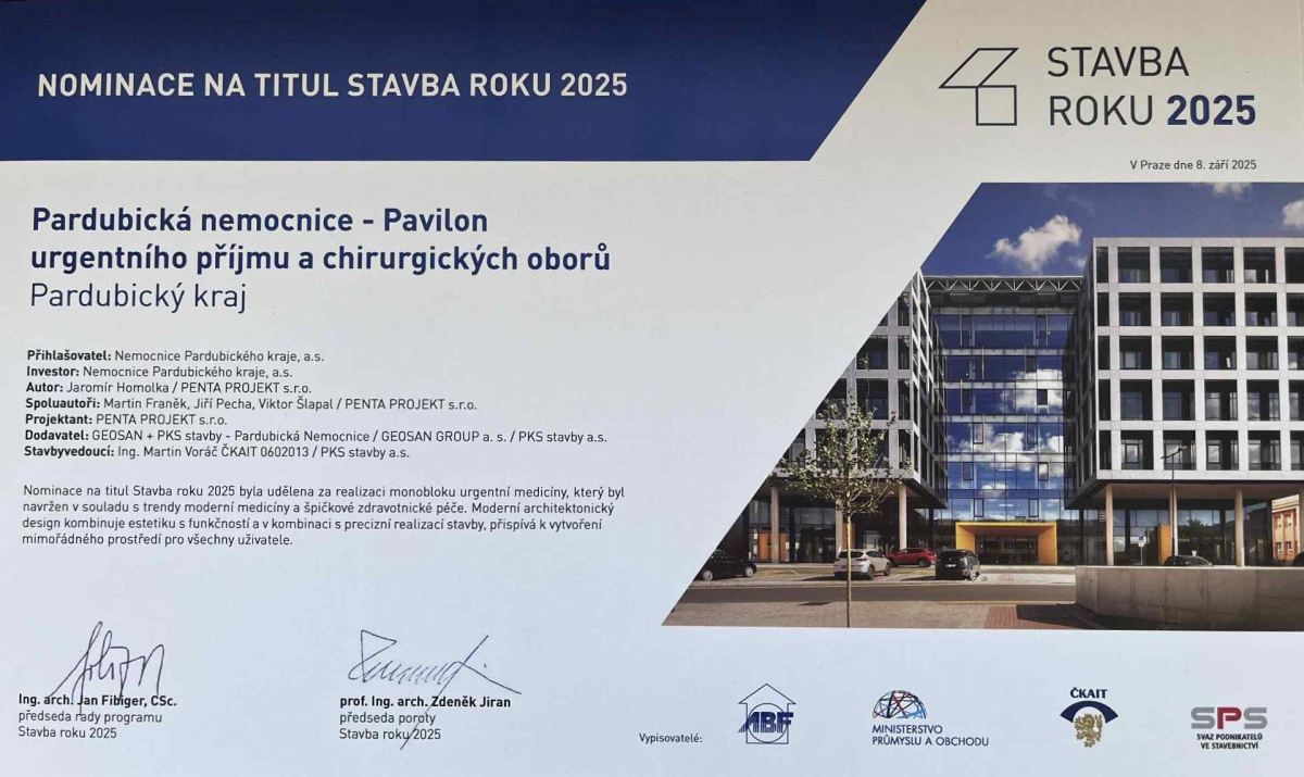 Pardubice – Mezi 46 nominovanými stavbami v prestižní soutěži 33. ročníku Stavba roku najdeme i budovu nového urgentního příjmu v Pardubicích.