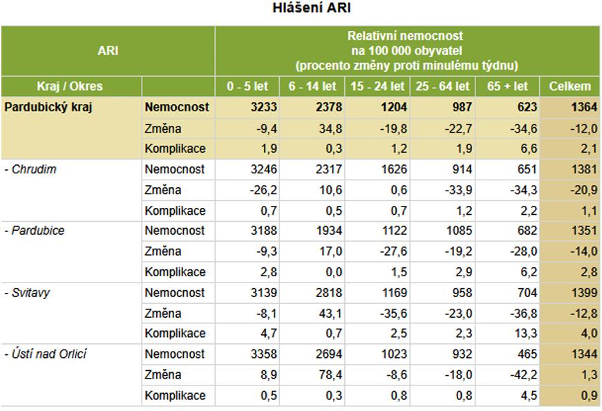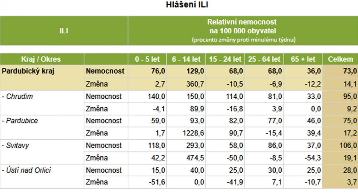 V Pardubickém kraji lékaři zaznamenali oproti předchozímu týdnu pokles v ukazateli ARI o 12 procent, ale u ILI byl naopak o 14 procent vyšší a tento skokový nárůst je patrný zejména ve věkové skupině školou povinných dětí.