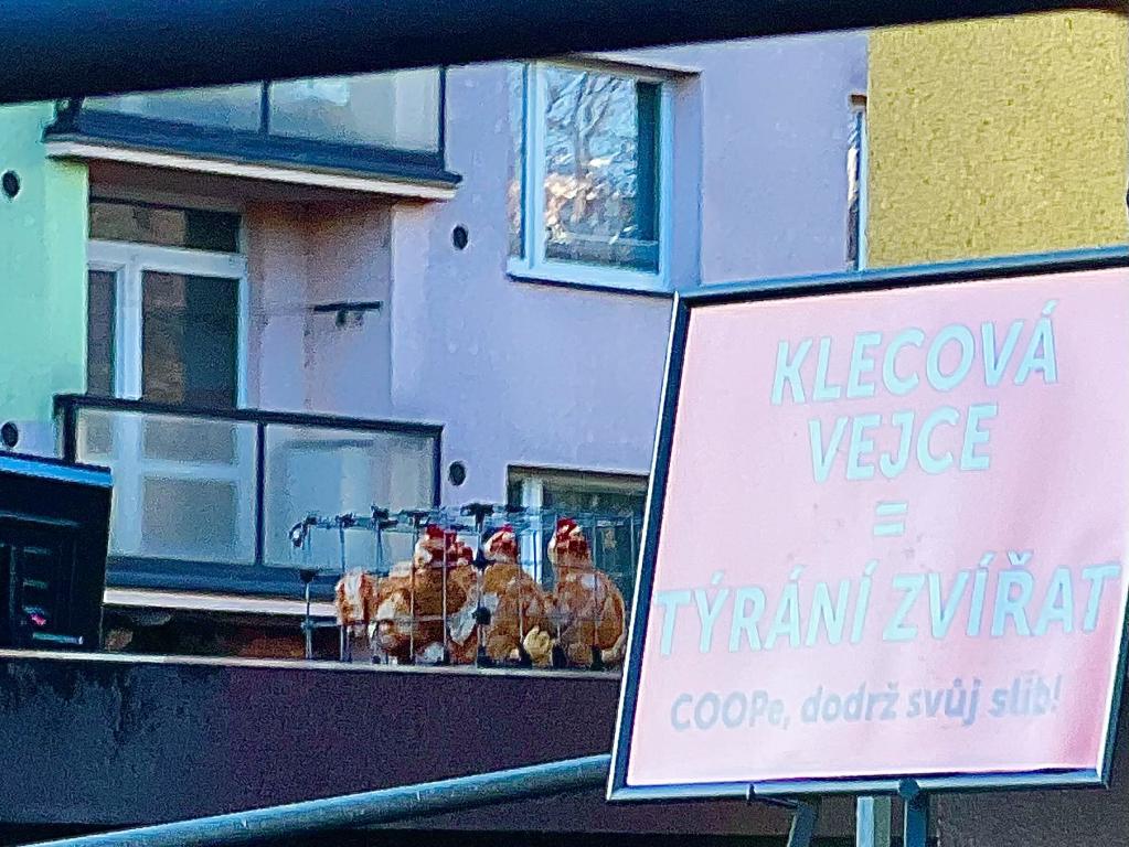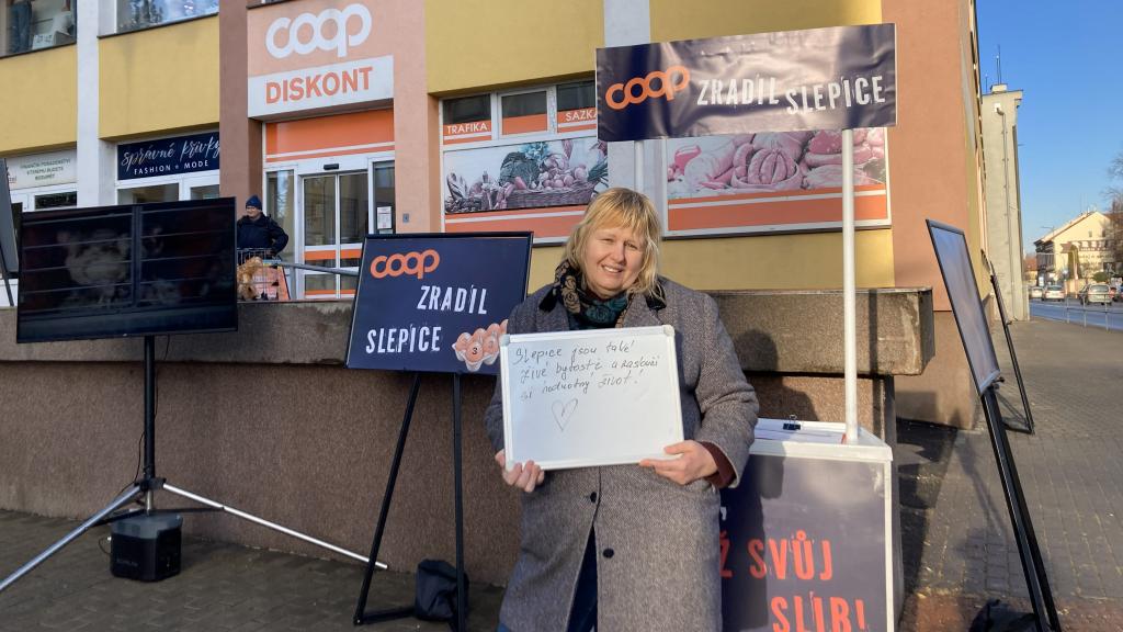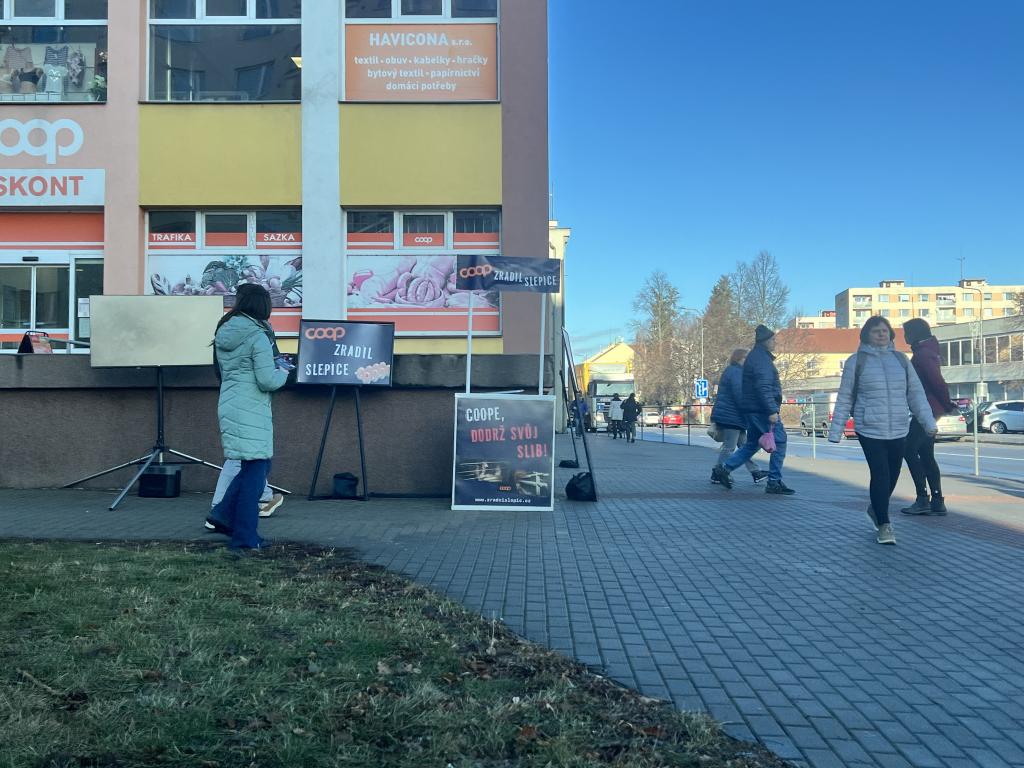 Chrudim – Obránci zvířat včera podnikli informační a protestní akci před chrudimskou prodejnou COOP na Palackého třídě, aby upozornili na špatné podmínky v klecích chovaných slepic.
