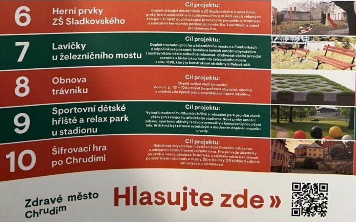 Kromě tradičních dětských hřišť a herních prvků a griloviště se tam ale objevuje i inovativní nápad na vznik šifrovací hry po Chrudimi, která by si také zasloužila uspět, protože kromě turistického ruchu současně podporuje i lokální obchody a služby. Rozhodnou občané: Hlasovat můžete až do 14. listopadu zde: Anketa - TVOŘÍM CHRUDIM 2025 | Munipolis